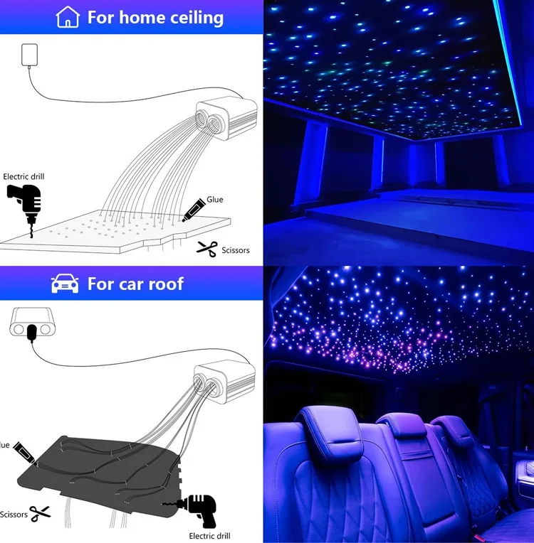 【Perfect Ceiling Decoration】: Our twinkle fiber optic star ceiling light sets are suitable to install in indoor,car headliner, shops, hotels, bars, coffee shops, DISCO, weddings decoration, home decoration,theater, KTVs, parties and any other leisure areas to make twinkle star decoration in ceiling sky roof