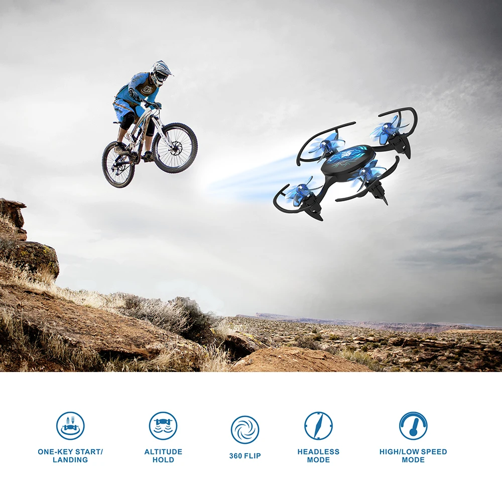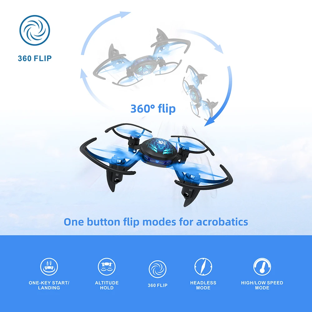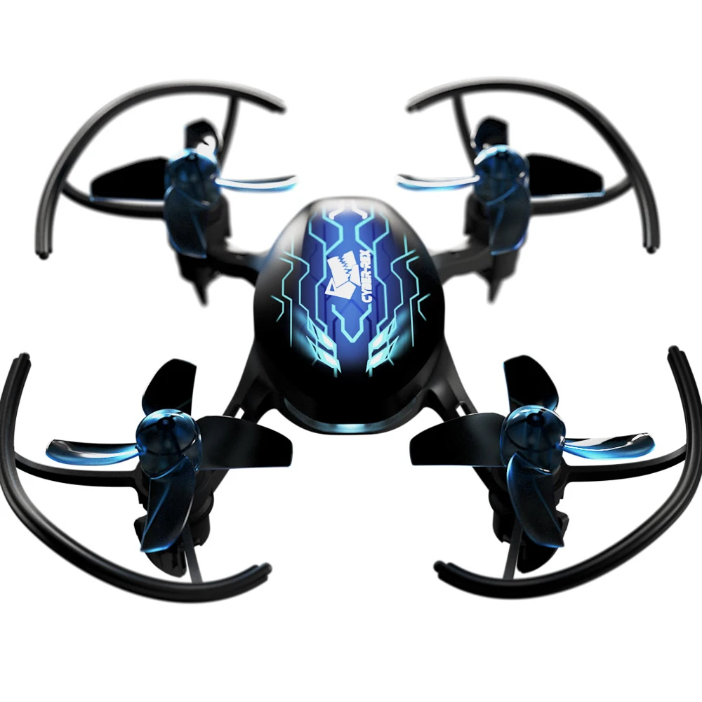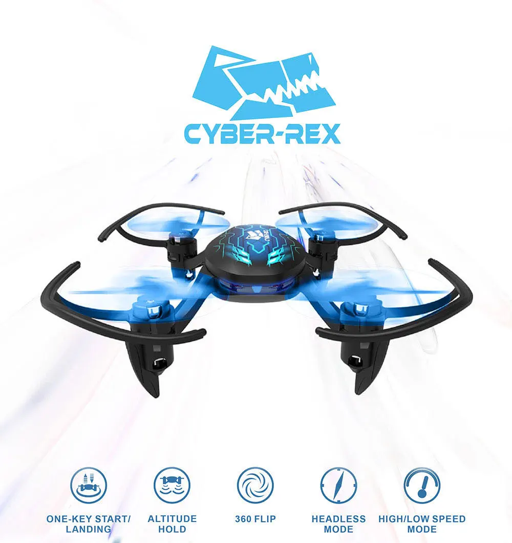 Start the drone with the press of a button, launching the drone a few feet in the air then holding its position with altitude hold or press the button again to automatically land. With 3 different speed modes, customize the performance of the Cyber-Rex to suit your flight style. If you're looking for an extra thrill to your flight, on the third mode you can press the flip button to automatically perform aerial acrobatics. Lost control of your drone? Enable headless mode to reorient the drone towards your position for easier control.