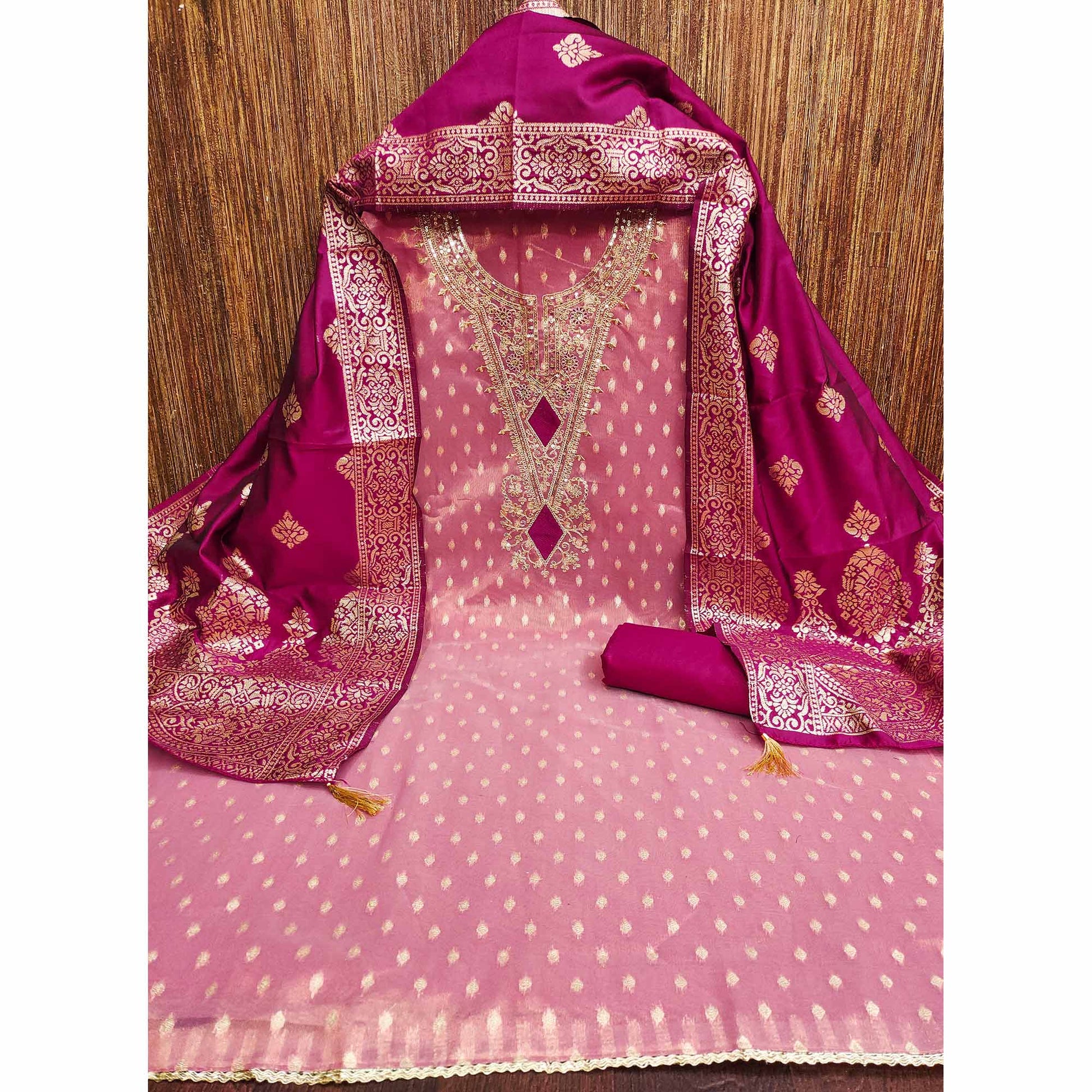 Gajari Pink Woven Banarasi Silk Dress Material With Intricate Cording & Sequin Embellishments