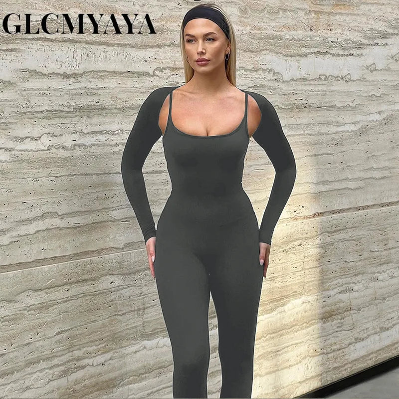 GLCMYAYA Women Streetwear Slim High Strecth Romper 2023 Casual Sporty Basics Solid Shawl Long Sleeve Jumpsuits 2 Piece Set