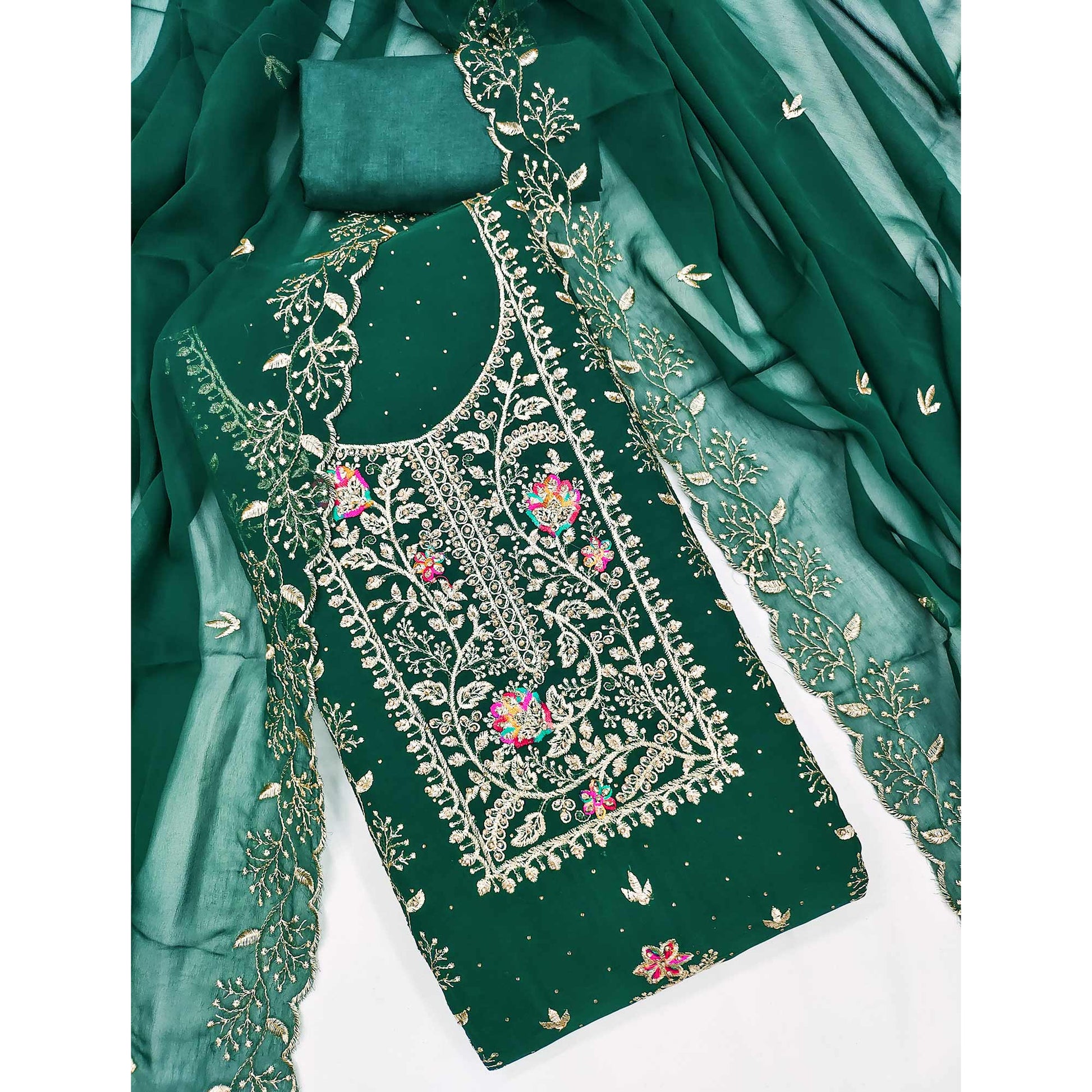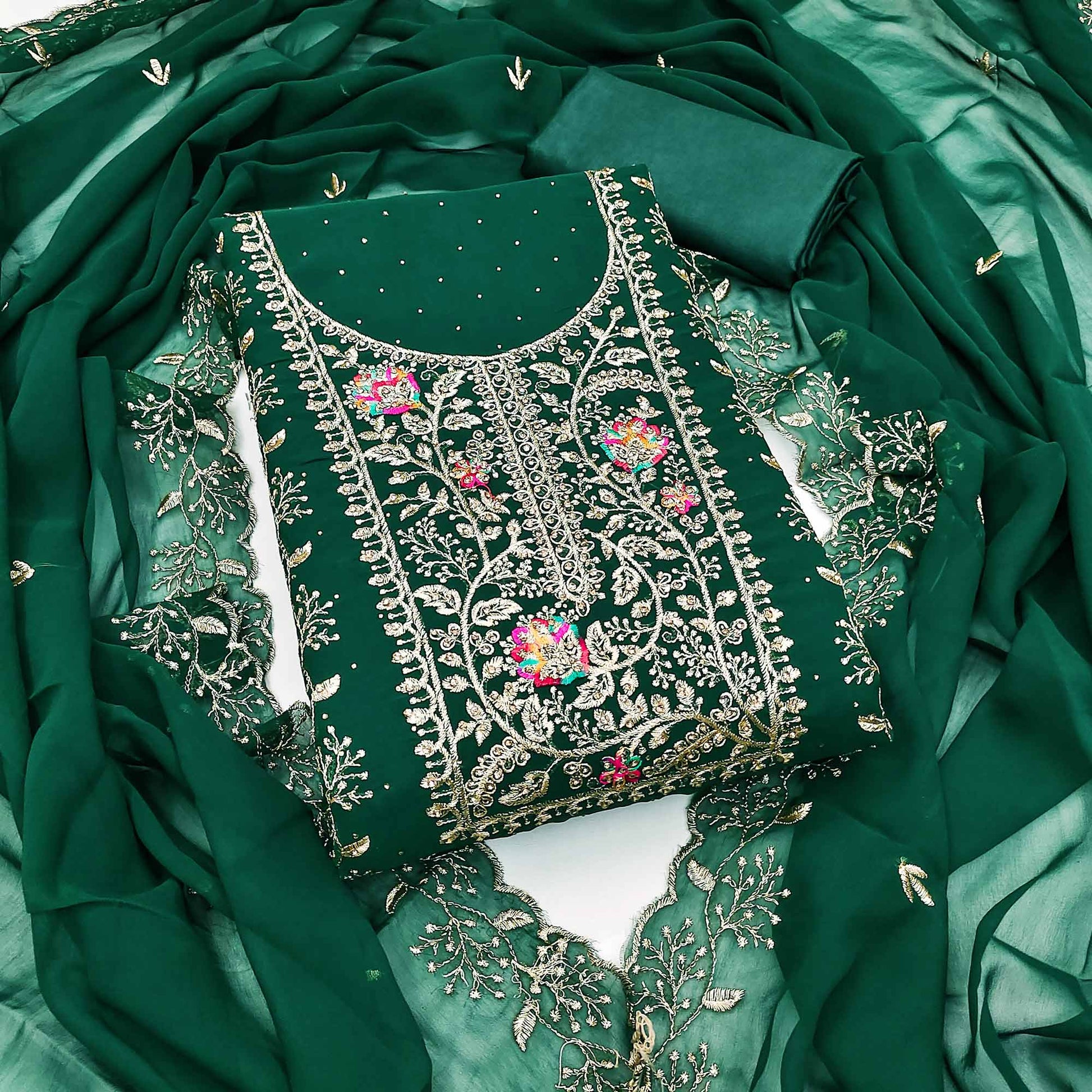 Green Georgette Dress Material With Floral Embroidery & Sparkling Stone Work