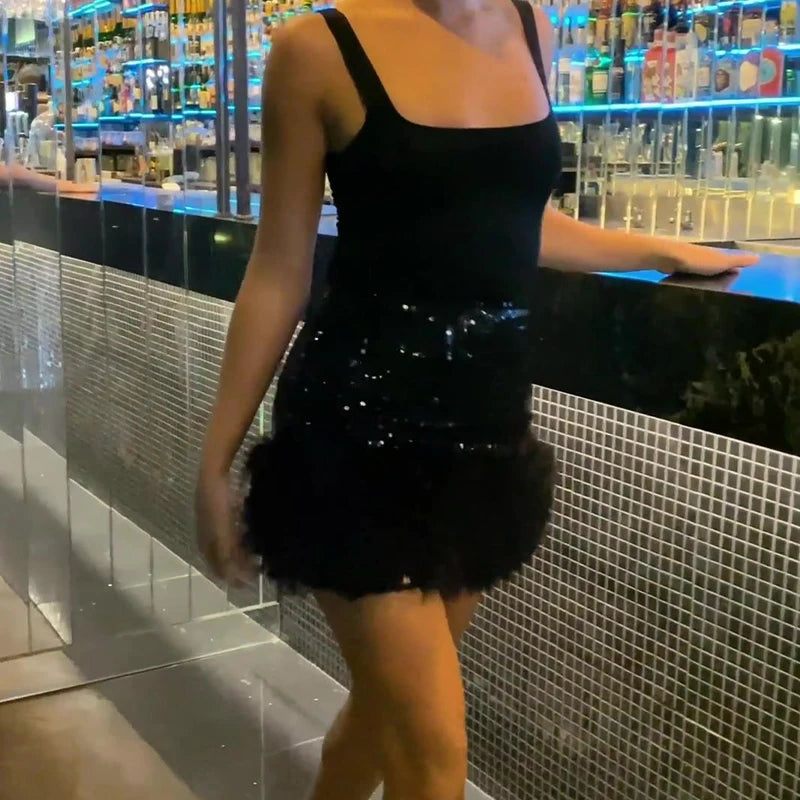 Ins Fashion Women Black High Waist Skirts Rose Pink Sequin Feather Trim Mini Skirt