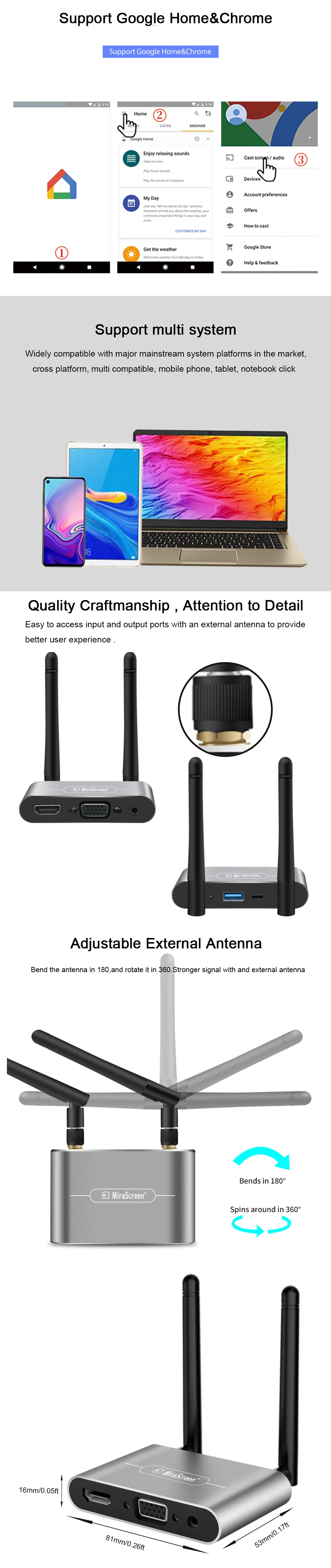 No need to switch between Airplay and Miracast mode. Just plug and play, no need to install drivers. Ultra low power consumption and low heat.