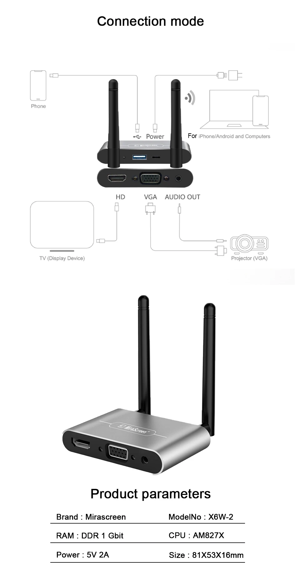 Wireless screen mirroring, sync mirror the screen of iOS and Android smartphone, tablet PC to any HD screen TV or projector, perfect for PPT presentation and video watching.