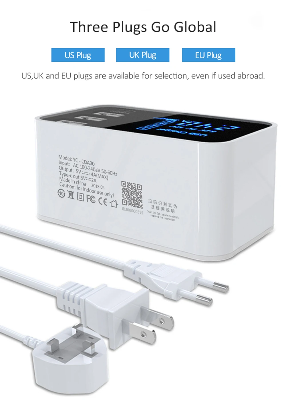 Plug standard: UK plug, US plug, EU Plug (optional)